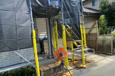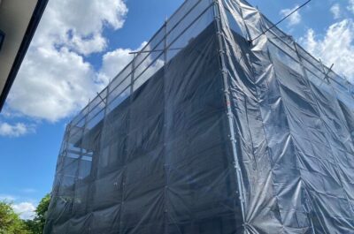 近隣へ塗料が飛散しないよう、メッシュシートを綺麗に張ります😊