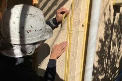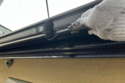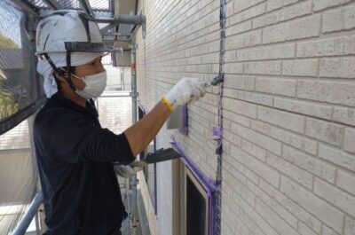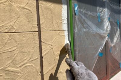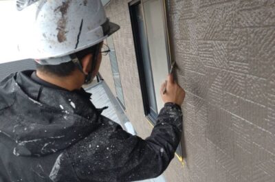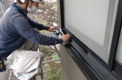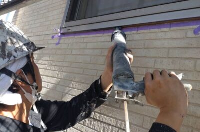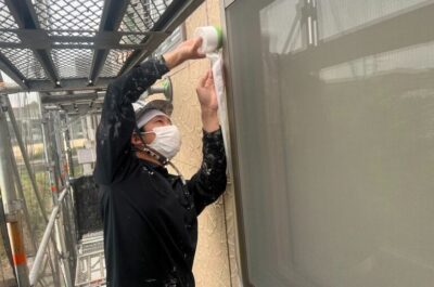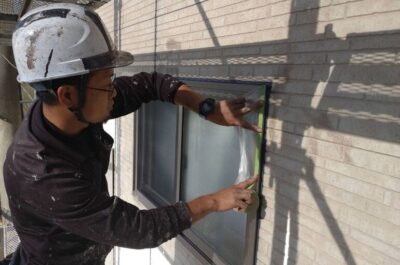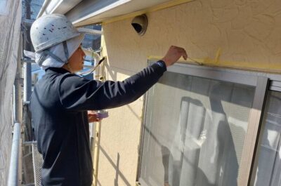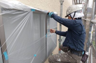 コーキング完了後、窓などの養生を行います。