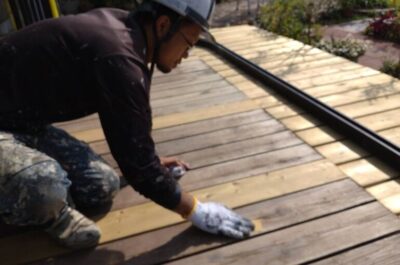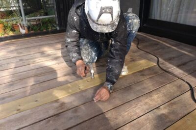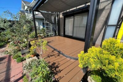 ウッドデッキは劣化している部分がありましたので補強を行ったあと、防腐剤入りの専用塗料で塗装を行いました。