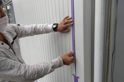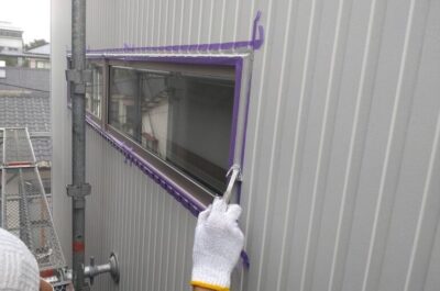 クリアー部分のコーキングは後打ちで仕上げますので、マスキングテープを貼っていきます。