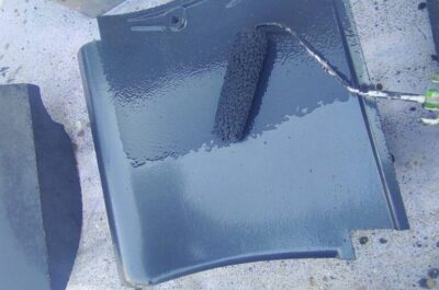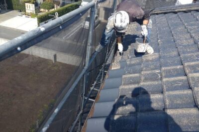 屋根の先端部分(小口)の中塗りを刷毛やローラーを使って行います。