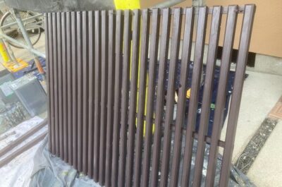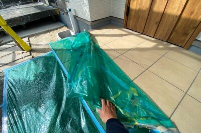 仕上がりがわかるよう、一部メッシュシートを剥がしました。