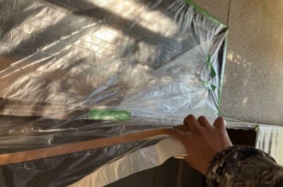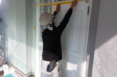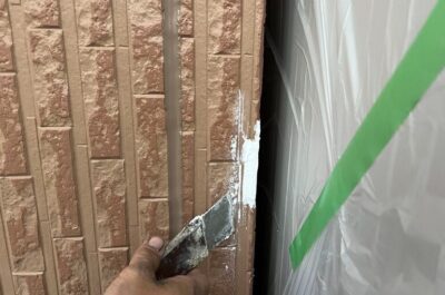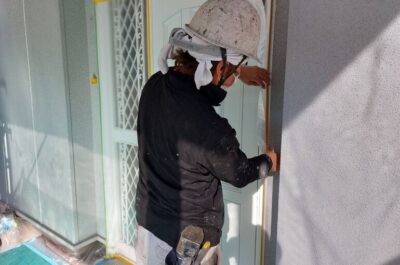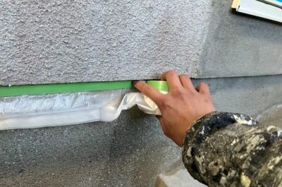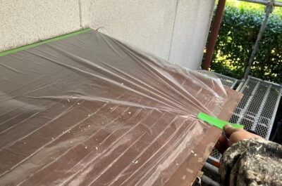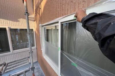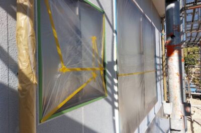 本日、窓や土間などの塗装しない部分の養生作業を行います。