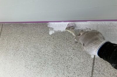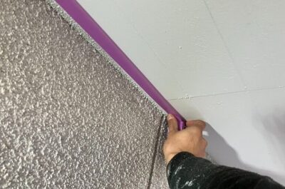 外壁の下塗りを行うため、軒天の養生を行います。