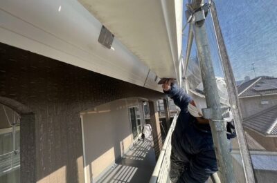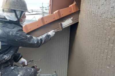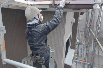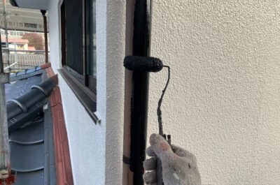 破風や鼻隠し、雨樋を刷毛やローラーを使って塗装していきます。