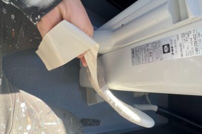 傷んでいる室外機のホースを巻き直します。