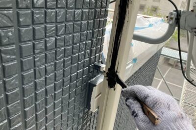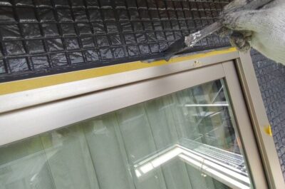 窓に漏れている塗料の掃除や、ラインを真っ直ぐ塗る手直し作業を行いました。