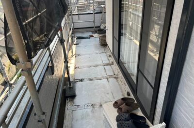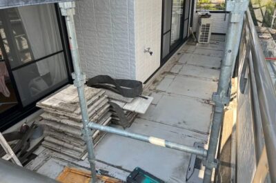 ベランダの塗装を行うため、敷き詰めてあるタイルを取り外します。