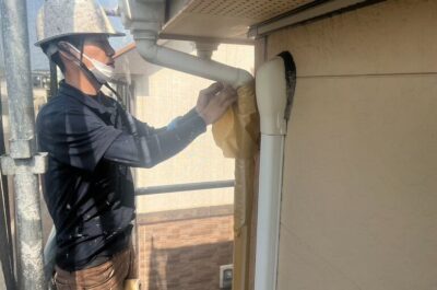 本日、帯や雨樋などの付帯部分の塗装を行いました。