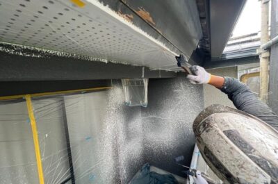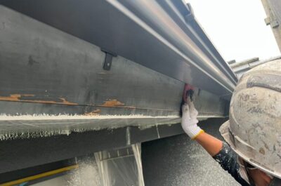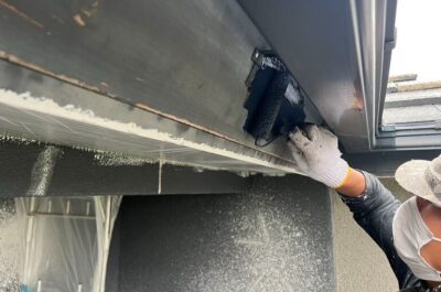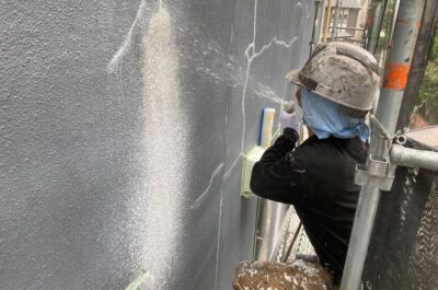 ひび割れが大きい部分はUカットを行い、模様をつけて塗装していきます。