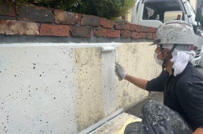塀の下塗りを行います。