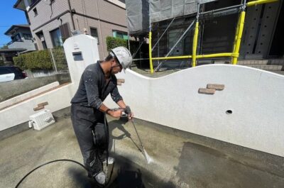 外壁やベランダ、土間などを丁寧に洗っていきます。
