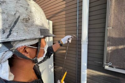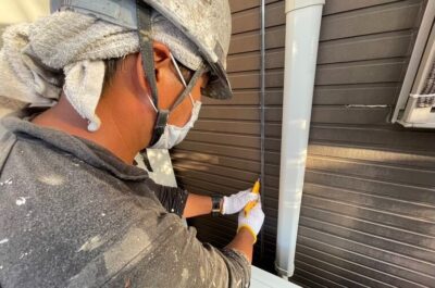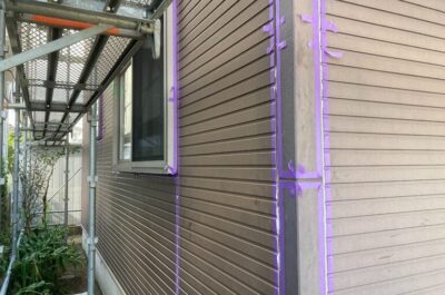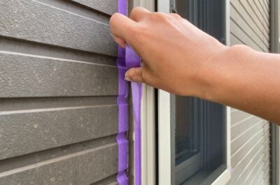 A様邸、本日は下地処理作業(シーリング)を行います。