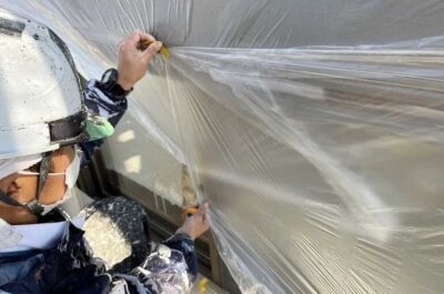昨日、旧シーリング材の撤去やマスキングテープ貼りを行いました。