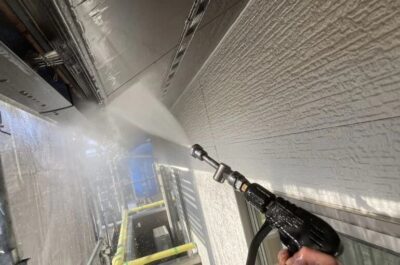 雨樋や軒天、外壁などを高圧洗浄機で綺麗に洗っていきます。
