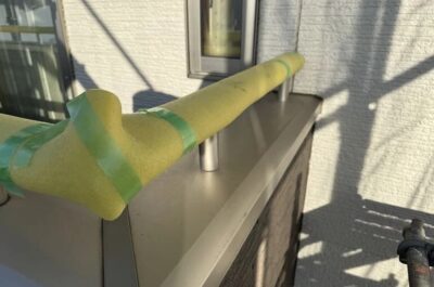 ベランダ手摺などは傷をつけないよう、保護具で養生しました。