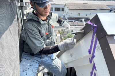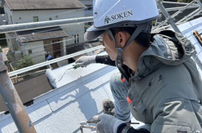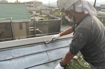 屋根(板金部分)の下地処理と下塗りを行いました✨
