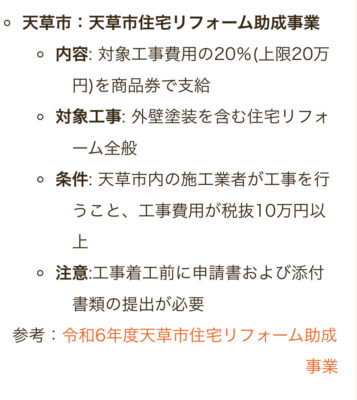 塗装工事のみに限定しますと↓の写真のような、熊本市外では地域活性化ために地域の業者で施工すれば数万円の助成金をうけとることができる地域もございます。