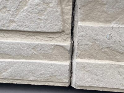 次にコーキング材に含まれる可塑剤が抜けて、コーキング材にひび割れが発生します。更に劣化するとコーキング材が風化してしまい、ボロボロと目地からコーキング材が剥がれ落ちてきます。