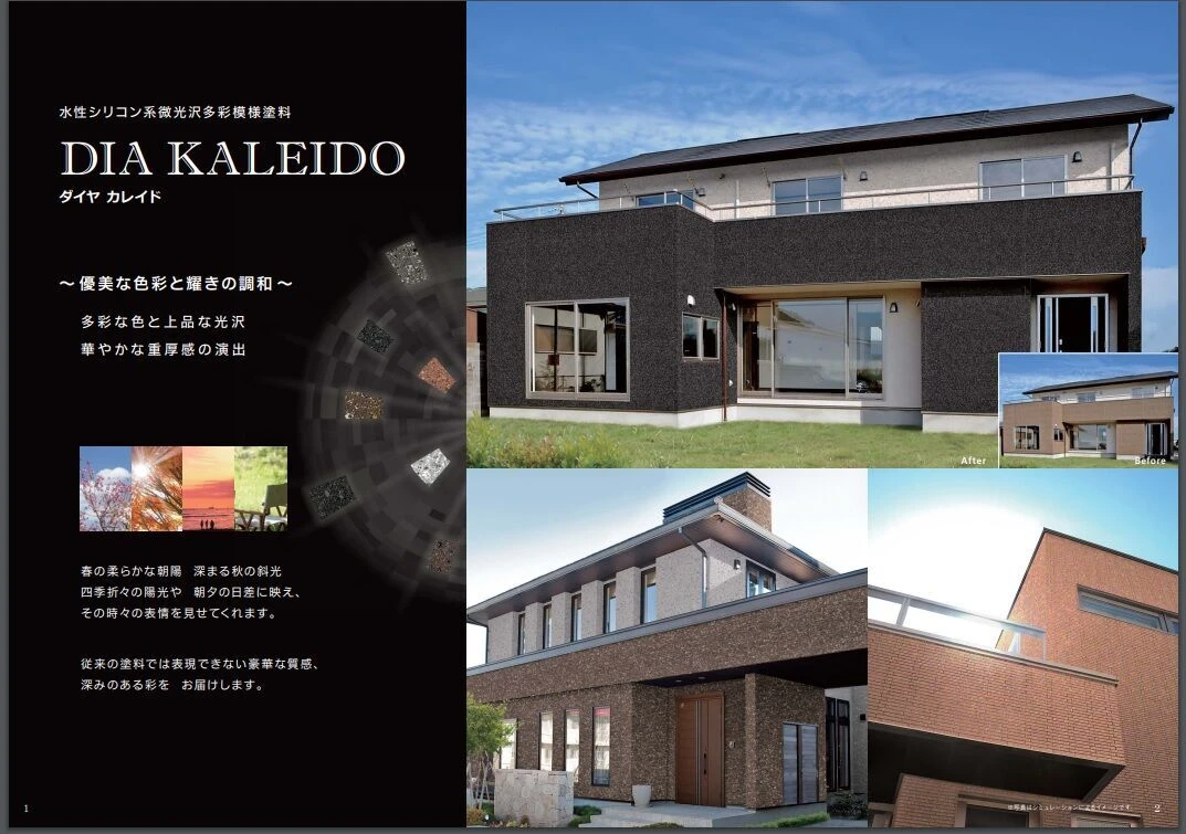 耐久性と高級感のある仕上がりが特徴 もう一つの特徴は高級感のある仕上がりです! 弊社の職人一同、『これは良い!』と口を揃えるほど美しい仕上がりになります。 通常の塗装は単色の仕上がりですが、ダイヤカレイドはクリヤーにカラーフレークが散りばめられ高級感のある、新築以上の仕上がりになります!