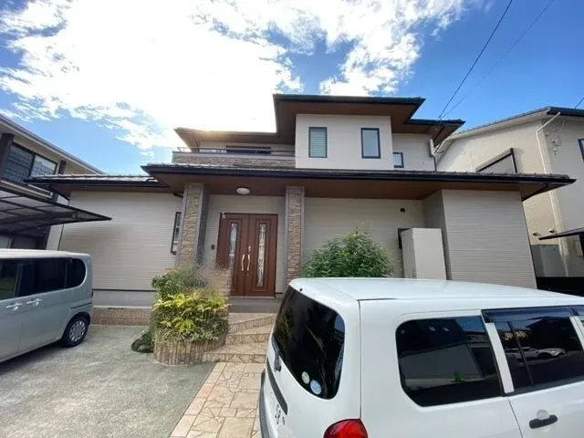 デザインは、外壁の色はあまり変えず、軒天にアクセントで差し色を使用し、コーナー柱にダイヤカレイドを吹き付けることで高級感のある仕上がりになりました。